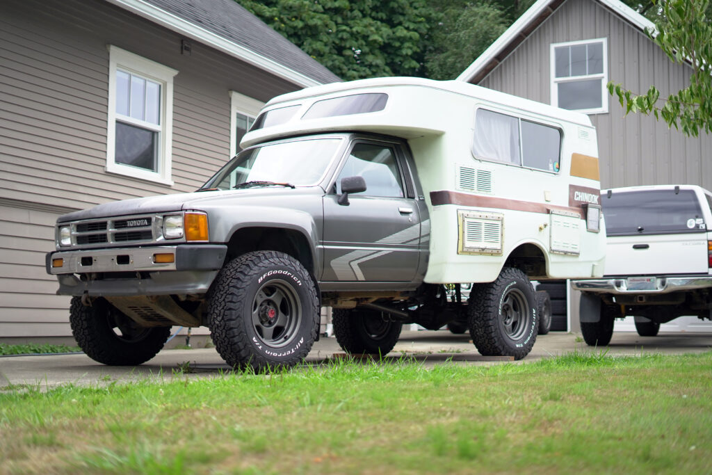 The next phase of our Toyota Chinook project involved mounting the camper shell onto the frame of a 1988 Toyota 4×4 pickup—check back soon for updates as the build moves forward.